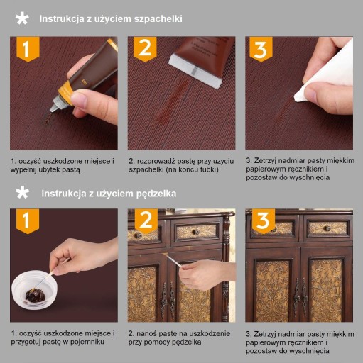 - po wyschnięciu pasta osiąga twardość zbliżoną do drewna, przez co można uzyskać trwałą i estetyczną naprawę uszkodzenia.