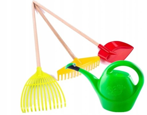 SKŁAD ZESTAWU: TACZKI DZIECIĘCE (z elementami metalowymi) + NARZĘDZIA (grabki zwykłe, grabki do liści oraz łopata)konewka