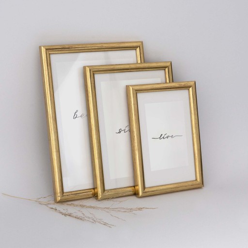 Fotoramki w kolorze złotym o przekroju profilu 12x13 mm wykonane w 100% z drewna. Pakiet ramek drewnianych jest doskonałą propozycją do ekonomicznej oprawy zdjęć, rysunków, druków. Ramki pakowane są w zestawie po 5 szt. Wyposażone są w szkło mineralne. Plecki wykonane są z twardej płyty HDF. Ramki na zdjęcia do rozmiaru 18x24 cm dodatkowo posiadają stopkę / nóżkę która pozwala eksponować oprawiony obraz na biurku lub regale. Pakiet ramek drewnianych PINIA dostępny jest w rozmiarach od 10x15 cm do 30x40 cm.