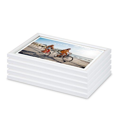Fotoramki w kolorze białym o przekroju profilu 12x13 mm wykonane w 100% z drewna. Pakiet ramek drewnianych jest doskonałą propozycją do ekonomicznej oprawy zdjęć, rysunków, druków. Ramki pakowane są w zestawie po 5 szt. Wyposażone są w szkło mineralne. Plecki wykonane są z twardej płyty HDF.