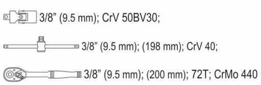 Klucze nasadowe, jak i napęd nasadek, zostały wykonane z wytrzymałej, narzędziowej stali chromowo-wanadowej CrV 50BV3.