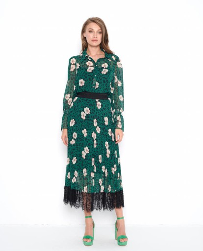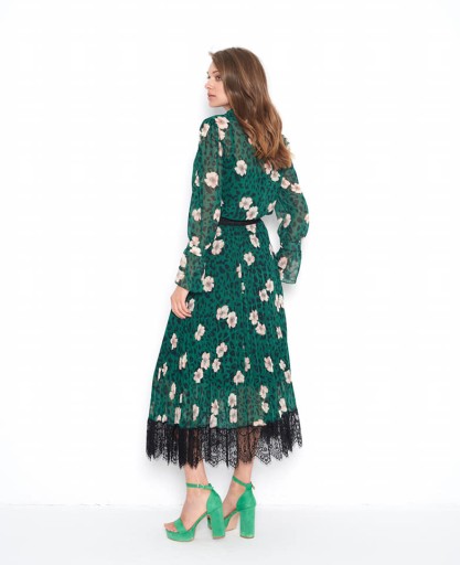 Komplet wykonany z delikatnego szyfonu. Zielone tło zdobią czarne cętki oraz orientalne kwiaty.
