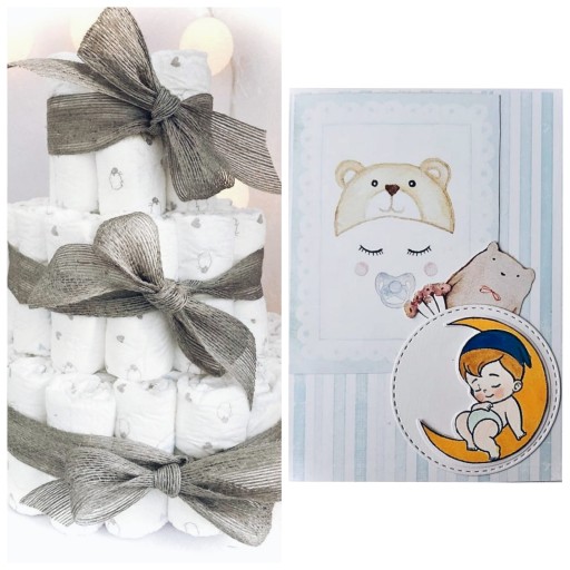 Tort ma średnicę z celofanem około 30cm, natomiast wysokość to około 40cm. Każdy z tortów jest świeżo robiony i starannie zapakowany w celofan i przewiązany materiałową wstążką. Do tortu dołączona będzie ręcznie robiona kartka. Na zdjęciu widnieje przykładowy eksponat. Karteczki są różne i każda niepowtarzalna. Prosimy o podanie informacji w wiadomości, czy karteczka ma być dla chłopca czy dla dziewczynki. Jeśli zależy Państwu na wyborze konkretnego wzoru, warto zapoznać się z aktualnym „kartkowym” asortymentem na moich aukcjach :) Na specjalne życzenie wydrukuję i wkleję dowolny tekst. Serdecznie zapraszam do zakupu. Całość stanowi idealny prezent dla Maluszka!