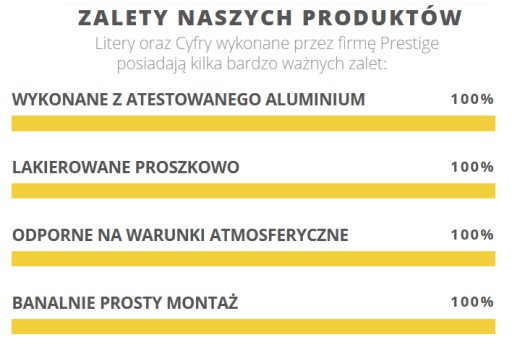 Cyfry i litery wykonane z atestowanego aluminium i zabezpieczone lakierem proszkowym odpornym na warunki atmosferyczne.