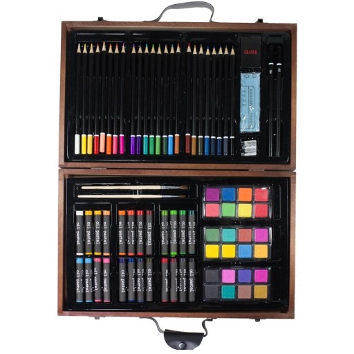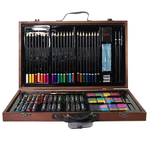 - Zestaw artystyczny zapakowany jest w drewnianej walizce, z wygodnym uchwytem, dodatkowo posiada on małe rozmiary, dzięki czemu możemy go zabrać ze sobą dosłownie wszędzie.