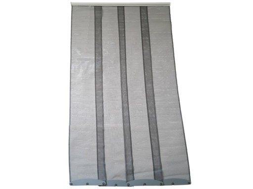 Zasłona składa się z górnego profilu w kolorze białym oraz szarych pasów siatki z obciążnikami