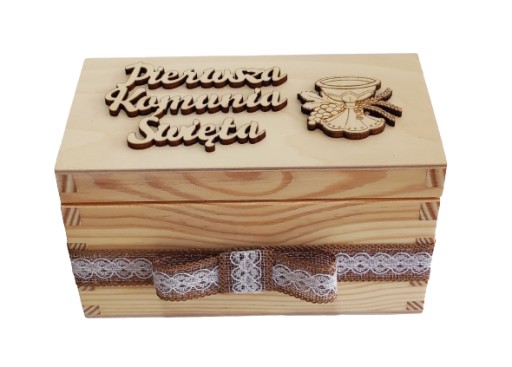 - Na wieczku od strony zewnętrznej przyklejony jest piękny napis Pierwsza Komunia Święta oraz kielich