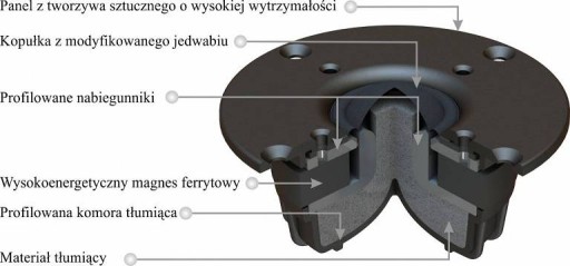 - Profilowany układ magnetyczny zapewnia doskonałe skupienie pola w szczelinie co w znaczący sposób redukuje zniekształcenia harmoniczne.