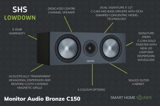 Bronze C150 współpracuje z lewym i prawym głośnikiem i został zaprojektowany tak, aby mógł być centralnym punktem zestawu kina domowego. 25-milimetrowy przetwornik wysokotonowy C-CAM Gold Dome Tweeter i dwa 5,5-calowe przetworniki nisko- średniotonowe C-CAM zapewniają wyjątkową dyspersję dźwięku, a dzięki temu szeroką scenę dźwiękową z płynną akcją i wyraźnymi dialogami.
