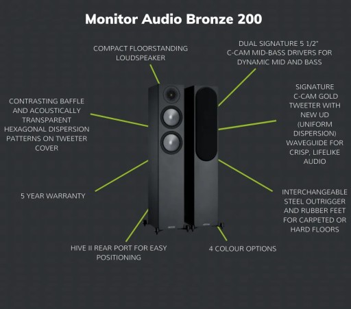 Nasze pięknie proporcjonalne kolumny podłogowe Bronze 200 oferują zaskakująco duży dźwięk. Wyposażone w wiodące w swojej klasie technologie firmy Monitor Audio oferują doskonały stosunek jakości brzmienia do wielkości.