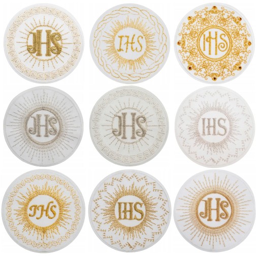 Ozdobna aplikacja w kształcie Hostii przeznaczona do przyszycia. Idealnie nadaje się na Chrzest, Pierwszą Komunię Świętą. Doskonała jako ozdoba kościelna. Bardzo starannie wykonana. Wykonana z materiału odpowiedniego do prania w temperaturze 40 stopni. Od spodniej strony z minimalną ilością nitek od haftu. Bardzo cienka.