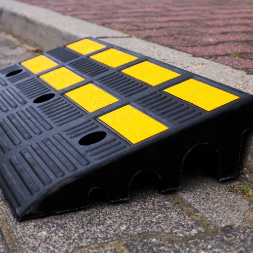 Najazd wykonany z wytrzymałej gumy EPDM zbrojonej kordem, idealny przy zastosowaniu jako podjazd do wysokich krawężników. Może być montowany do nawierzchni za pomocą elementów montażowych (kołki rozporowe) lub używany jako element tymczasowy.