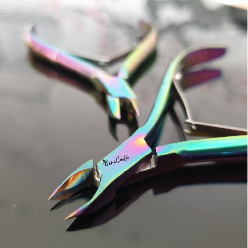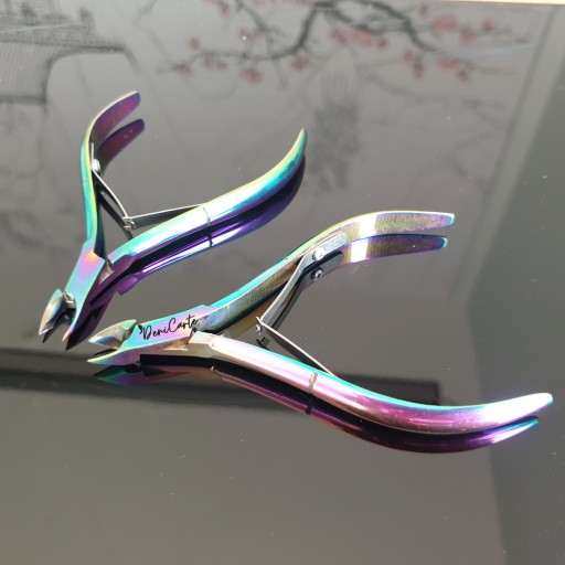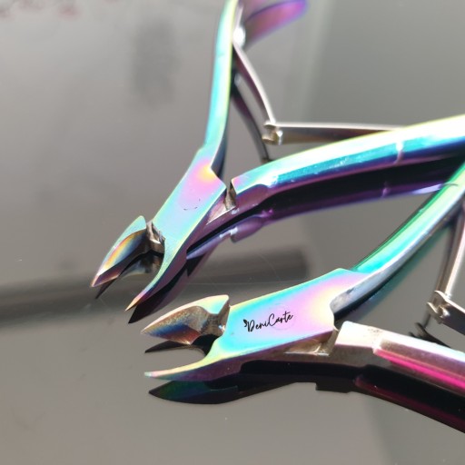 Cążki do wycinania skórek. Najmodniejszy wzór kameleon rainbow. Mieni się kolorami tęczy. Wykonane ze stali nierdzewnej.