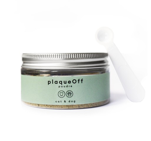 PlaqueOff to nowatorski preparat przeznaczony do codziennego stosowania u psów i kotów. Wydzielany ze śliną ogranicza odkładanie płytki nazębnej. Całkowicie naturalny, zawiera algi morskie, pozyskiwane z Oceanu Atlantyckiego. Niepowtarzalny, chroniony patentem, utrudnia przyleganie płytki nazębnej do wszelkich powierzchni w jamie ustnej, a także powoduje rozmiękczenie twardych złogów kamienia nazębnego. Poprawa widoczna jest już po 3 do 8 tygodniach stosowania.