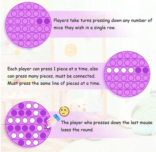 - bąbelki - ich naciśnięcie generuje delikatny trzask jak w przypadku pstrykania folią bąbelkową. Po wyciśnięciu całej powierzchni wystarczy odwrócić zabawkę i klikać od nowa
