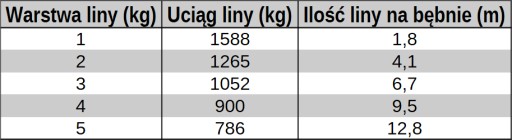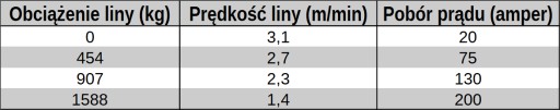 Szybkość zwijania liny i pobór prądu (pierwsza warstwa liny na bębnie):