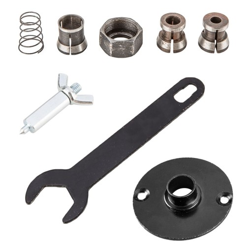 - W zestawie: klucz płaski, tuleja prowadząca do kopiowania według szablonu, szpikulec do frezowania po okręgu, adapter do odsysania pyłu z redukcją, trzy tuleje zaciskowe o średnicach 6, 8, 12 mm, aluminiowa prowadnica równoległa