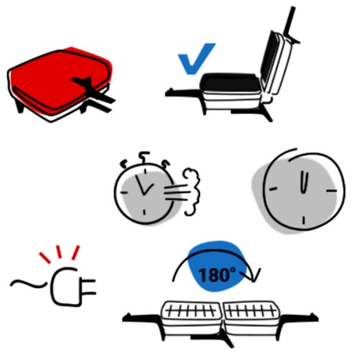 Podstawowymi elementami opiekacza są płyty grzewcze - dolna i górna, wykonane ze stopu aluminium i pokryte od strony roboczej Greblonem. W płytce dolnej znajduje się fabrycznie ustawiony ogranicznik temperatury utrzymujący odpowiednią temperaturę pracy urządzenia. Wyrób dopuszczone do kontaktu z żywnością. Posiada atest PZH.