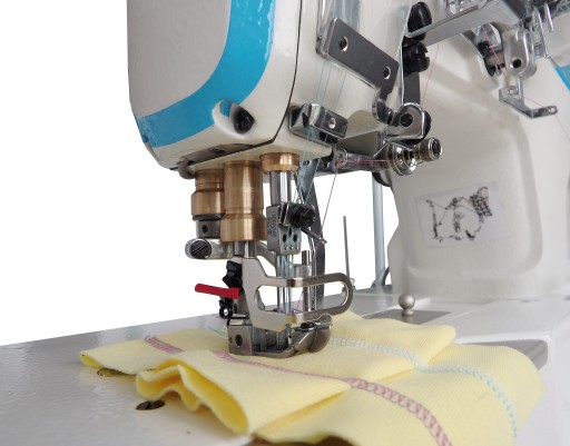 ◾ Profesjonalna, 3-igłowa, 5-nitkowa renderka (interlok, kapówka) z płaskim łożem i transportem dyferencjalnym przeznaczona do krawiectwa lekkiego i średniego