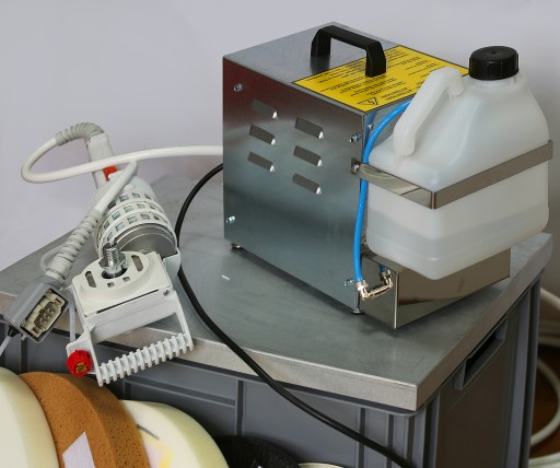 Spryskiwacz wody z pompką i zbiornikiem model DM-1 M/P , to model zaopatrzony w 5 L zbiornik wody wraz z pompką i wężem doprowadzającym wodę do uchwytu zacieraczki; dzięki temu z łatwością można nawilżać powierzchnię zacieranego tynku bez przerywania pracy.