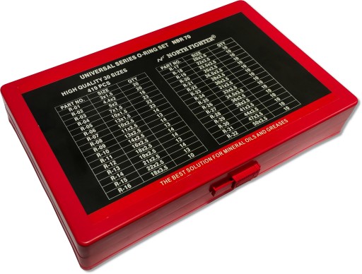 W zestawie znajduje się łącznie aż 419 szt. uszczelek w różnych rozmiarach, opakowane w solidną skrzynkę z tworzywa sztucznego, zamykaną na zasuwkę.
