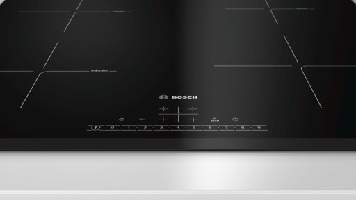 Płyta Indukcyjna Bosch PIE 631FB1E, o szerokości 59.2 cm, z 4 strefami grzewczymi, timerem z funkcją wyłączenia dla każdego pola, 17 poziomami mocy, 2 stopniowym wskaźnikiem zalegania ciepła, zabezpieczeniem przed dzieci oraz z wyłącznikiem bezpieczeństwa.