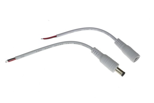 Złącze DC 2.10/5.50 mm składające się z wtyku oraz gniazda. Wtyk oraz gniazdo znajdują się na kablach o długości ok 15 cm. Kolor zestawu biały.