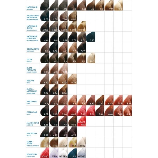 - paleta zawiera całą gamę odcieni dla zapewnienia bezpiecznej, jednolitej i niezawodnej koloryzacji.