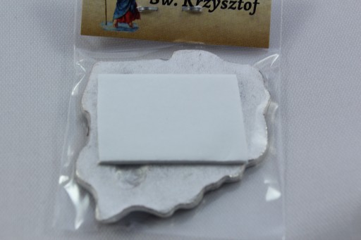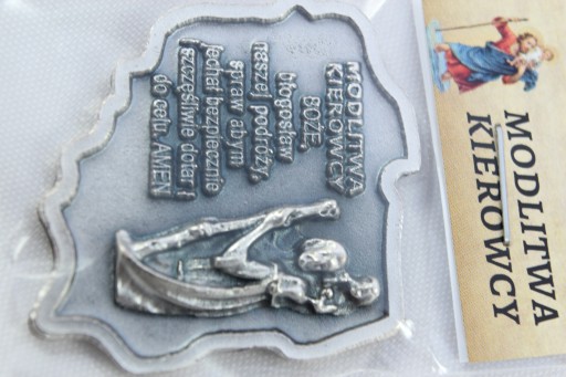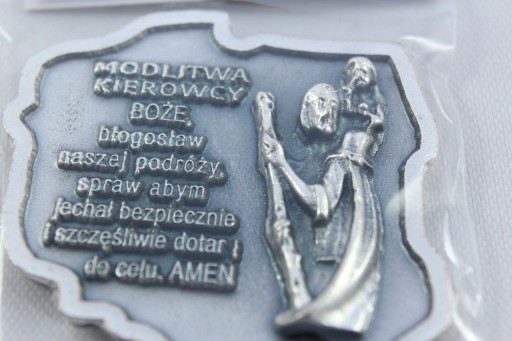 - Na plakietce jest krótka modlitwa kierowcy oraz Święty Krzysztof niosący na ramieniu Małego Jezusa
