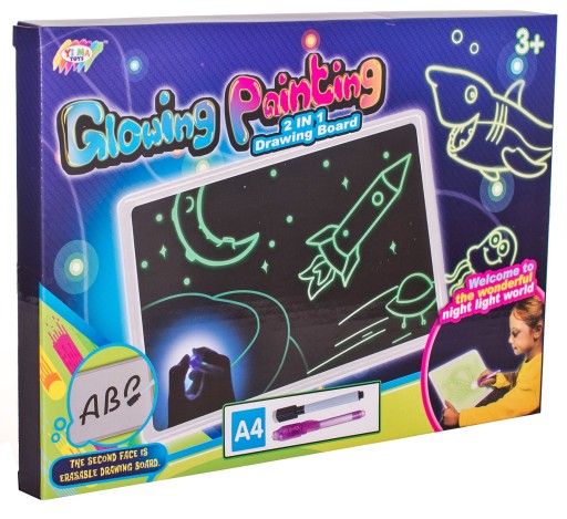 1,Na pierwszej stronie można malować światłem. Najlepiej malować w ciemnym lub prawie ciemnym otoczeniu. Deska kreślarska pokryta jest specjalną powłoką fotoluminescencyjną, która pochłania światło i tworzy efekt świecenia w ciemności.