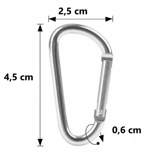 Bardzo praktyczny aluminiowy karabińczyk do zamocowania na pasku lub lince. Klamra wykorzystana może być również jako zawieszka lub element mocujący dla kluczy, sprzętu i narzędzi elektrycznych.