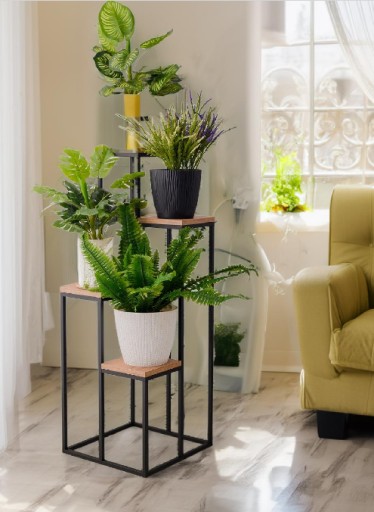 Nowoczesny pojemny metalowy kwietnik polskiej produkcji, solidnie wykonany a zarazem o pięknym i nowoczesnym wyglądzie. Spawana w całości konstrukcja stojaka ze stalowego profila 15/15 mm gwarantuje stabilność. Cztery półki z płyty meblowej oklejone imitacją dąb craft złoty o wymiarach 20/20 cm.