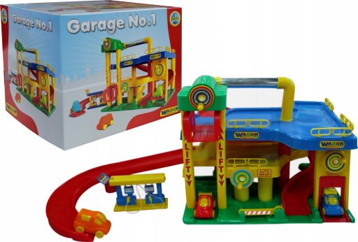 Zestaw to przede wszystkim 2 - poziomowa budowla z zabezpieczonymi barierkami miejscami parkingowymi i zjazdami. Posiada również dodatkowe stanowiska, które urozmaicą zabawę naszym dzieciom. Jest myjnia, w której obracają się gąbki podczas mycia pojazdu. Wystarczy przekręcić rączkę na specjalnej tarczy. Jest warsztat samochodowy, którego drzwi się otwierają i mini stacja benzynowa z dwoma dystrybutorami. Jest także winda, dzięki której maluch może przetransportować samochód z dołu do góry i odwrotnie. Otwierany szlaban przy jednym z wjazdów do garażu, to kolejny ruchomy element, którego nie mogło zabraknąć.