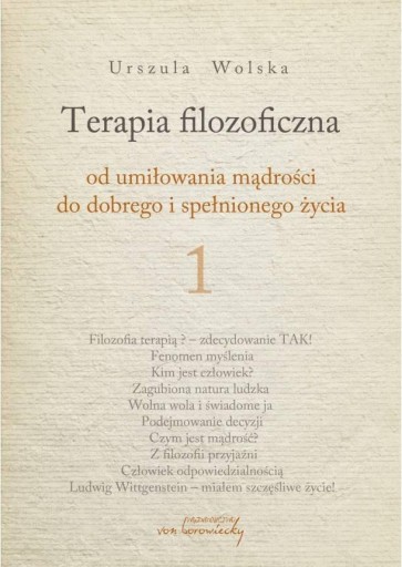 się już trzydzieści tekstów z filozofii praktycznej, które napisałam i które czytałam oraz omawiałam na form Salonów Filozoficznych. (...) Wszystkie teksty są też fundamentem prowadzonej przeze mnie terapii filozoficznej. Każdy tom zawiera 9 tekstów problemowych, a ostatni, 10. tekst, poświęcony jest wybranemu przeze mnie filozofowi. Wybieram myślicieli, którzy są mi bliscy i których teksty pomagają nam w czynieniu refleksji nad naszym życiem”. Praktyczny wymiar tekstów Urszuli Wolskiej sprawia, że są one pomocą dla tych, którzy nie tylko pragną pogłębić namysł nad własnym życiem, ale także chcą uczynić je lepszym dla siebie i innych; lepszym tzn. bardziej ludzkim, otwartym na Prawdę, Dobro i Piękno w świecie, a przede wszystkim w drugim człowieku jako osobie rozumnej i wolnej. Wbrew dominującemu przeświadczeniu, często wywołanemu w nas nawałem kłopotów i problemów, jakie spadają na nas każdego dnia, nasze życie rzeczywiście może być lepsze. Możemy żyć lepiej i być lepszymi dla innych, a wtedy i ich życie uczynić dostatniejszym, przyjemniejszym, piękniejszym. By tak było, potrzeba jednak przede wszystkim, byśmy uczynili nasze życie rozumniejszym. Musimy używać rozumu, być świadomymi faktu swej wolności... To są warunki konieczne i zarazem możliwe do spełnienia, choć wymagają nieco wysiłku. Możemy je spełnić, bo każdy z nas jest zdolny do życia rozumnego i wolnego, właśnie w tej kolejności. Nie musimy być naśladowcami innych, nie musimy stawać w szeregach fanów i wyznawców rozmaitych celebrytów, nie musimy być niewolnikami mód i trendów... Filozofia jest tą dziedziną ludzkiej aktywności intelektualnej, która nam w tym pomoże, a filozof świetnym przewodnikiem na drodze do odzyskania swego życia i obdarowania nim, już jako własnym, innych. 1 Tom, poza tekstami Wstępów, zachęca do podjęcia rozważań na następujące tematy: Wstęp do tomu 1 1 Filozofia terapią? — zdecydowanie TAK! 2 Fenomen myślenia 3 Kim jest człowiek? 4 Zagubiona natura ludzka 5 Wolna wola i świadome JA 6 Podejmowanie decyzji — ujęcie filozoficzne 7 Czym jest mądrość? 8 Z filozofii przyjaźni 9 Człowiek odpowiedzialnością 10 Ludwig Wittgenstein — miałem szczęśliwe życie