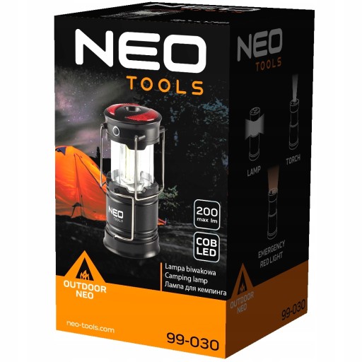 Wielofunkcyjny produkt 3 w 1 posiada 3 funkcje świecenia: latarka, lampa, czerwone światło ostrzegawcze. Lampa NEO charakteryzuje się solidną konstrukcją. Lampa posiada wysuwaną konstrukcję. Niewielki rozmiar produktu oraz duża uniwersalność sprawia, że lampa posiada szeroki zakres zastosowań. Produkt świetnie sprawdzi się w garażu, piwnicy, różnego rodzaju naprawach, a przede wszystkim poza miastem na campingu, podczas biwaku, wędkowania, etc. Lampa wyposażona jest w nowoczesne diody COB LED o strumieniu świetlnym 200 lumenów i mocy 3W. Dodatkowo posiada 2 uchwyty: boczny i górny co zwiększa jej funkcjonalność. Zasilana jest 3 bateriami AA (możliwe do zakupu w zestawie). Zgodność z europejskimi standardami bezpieczeństwa zapewnia certyfikat CE.