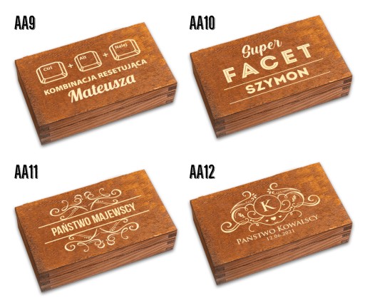 Całość została zapakowana w eleganckie drewniane pudełeczko, na wieczku pudełeczka wygrawerujemy wzór, który wybierzesz z dowolną dedykacją