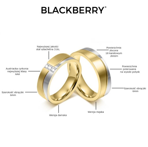Luksusowe obrączki ślubne wykonane z najwyższej jakości stali szlachetnej, chirurgicznej 316L. Te obrączki to wyjątkowo szlachetne połączenie stali i złota oraz błyszczących znanych na całym świecie Austriackich szlifowanych cyrkonii, które zdobią obrączkę damską. Perfekcyjne wykonanie z wysoką dbałością o wszelkie detale oraz połysk gwarantują produkt najwyższej jakości. Doskonała kompozycja stworzona, by cieszyć, zachwycać i podkreślać miłość, jaką darzą się osoby decydujące się na wspólne życie. Idealne obrączki, które chciałoby się nosić na palcu przez cały czas i nie zdejmować ich nawet na chwilę.
