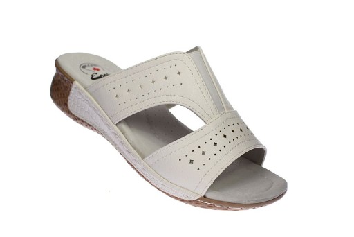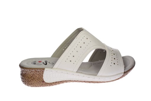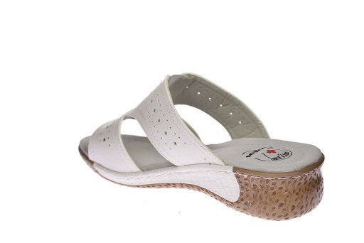 Białe klapki damskie z medycznej kolekcji firmy Enplus na koturnie ze skórzaną wkładką zapobiegającą poceniu się stóp serii medical comfort.
