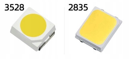 - W porównaniu do nieco starszy diod 3528 o tych samych wymiarach (długość, szerokość) jest od niej o 0,8 mm cieńsza przez co zyskujemy lepszy kąt świecenia. Również powierzchnia emitująca światło w diodzie 2835 jest większa.