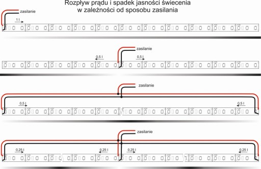 Ze względu na spadek napięcia na długości taśmy, moc dłuższych odcinków zasilonych w jednym miejscu będzie niższa niż wynika z iloczynu mocy i długości taśmy. W celu zapewnienia równomiernej jasności świecenia na całej długości taśmy należy przewody zasilające podłączyć co najmniej z obu stron taśmy