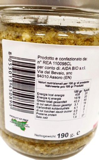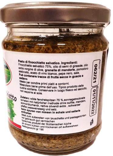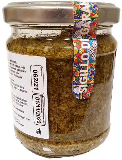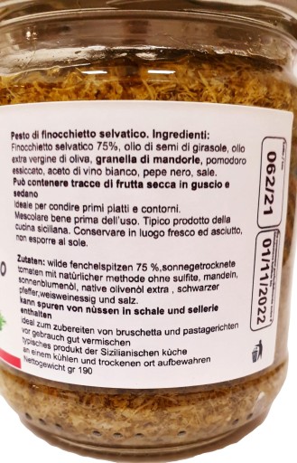 - Skład: dziki koper włoski 75%, olej słonecznikowy, oliwa extra vergine z oliwek, pokruszone migdały, suszone pomidory, ocet z białego wina, czarny pieprz, sól.