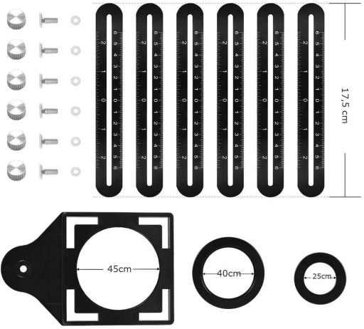 Przymiar wykonany został z lekkiego i trwałego aluminium oraz odpornego tworzywa sztucznego. Poszczególne moduły można przesuwać i mocować niezależnie od siebie - aluminiowe śruby gwarantują płynną regulację osadzenia poszczególnych elementów. Okrągły szablon przymiaru posiada wyjmowane pierścienie o różnych średnicach, które pozwalają precyzyjnie dopasować wielkość otworów.