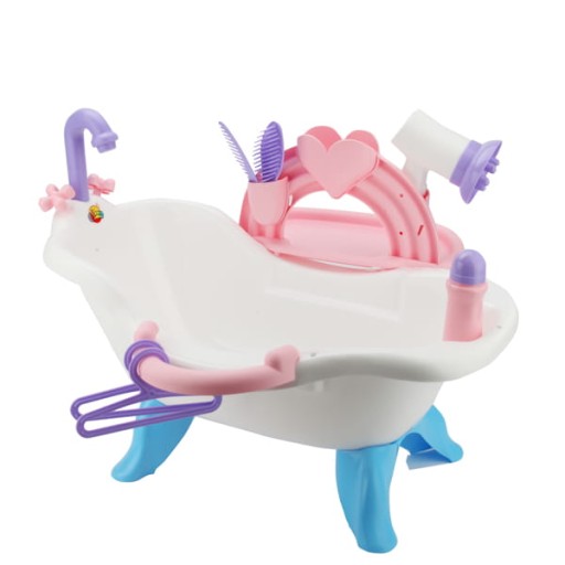 Zestaw kąpielowy dla dziewczynek zawiera wszystko, co niezbędne do kąpieli lalek . Oprócz przestronnej wanny zestaw zawiera szczotkę do włosów, suszarkę do włosów, wieszaki i wiele innych akcesoriów.