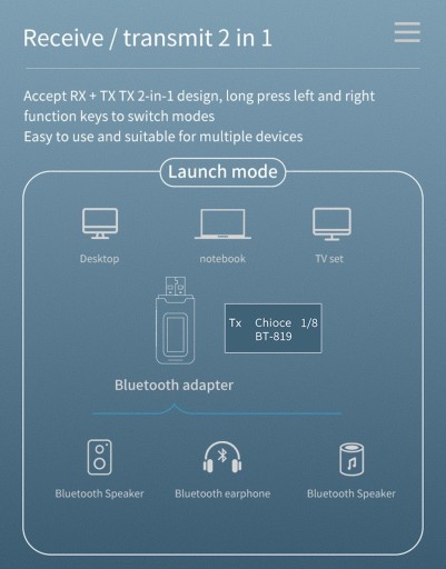 - nadawanie dźwięku przez komunikację Bluetooth z odtwarzaczy (laptop, smartphone, TV, odtwarzacze) wyposażone w złącze aux do odbiorników bluetooth (głośnik BT, słuchawki BT, inny adapter BT)
