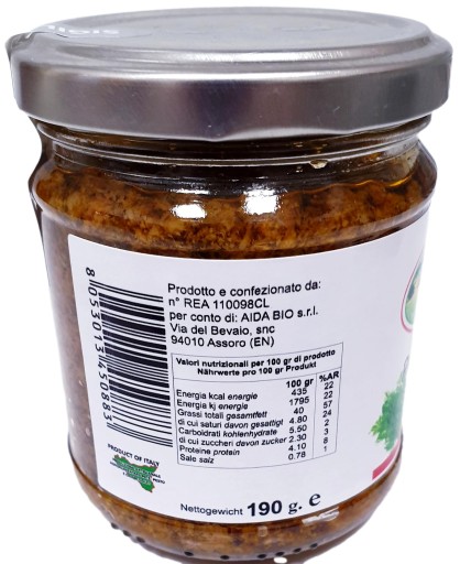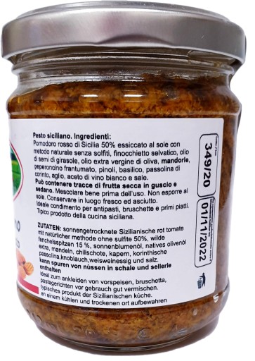 - Skład: czerwone sycylijskie pomidory suszone metodą naturalną na słońcu 50%, dziki koper włoski, olej słonecznikowy, oliwa extra vergine z oliwek,migdały, peperoncini, orzeszki pini, bazylia, suszone winogrona, czosnek, sól, biały ocet winny, sól.