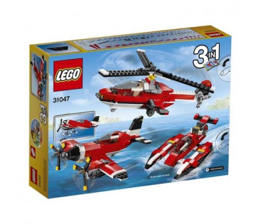 Tego klasycznego samolotu nie możesz przegapić! Jest utrzymany w przepięknej, czerwono-biało-czarnej kolorystyce, ma obracające się śmigła i otwierany kokpit z miejscem na minifigurkę (brak w zestawie). Wejdź na pokład, rozpędź się na pasie i wznieś w przestworza! Później zawróć nad lotnisko, wypuść podwozie i pokaż, co to znaczy idealne lądowanie! Możesz też przerobić swój samolot na supernowoczesny wodolot albo helikopter.
