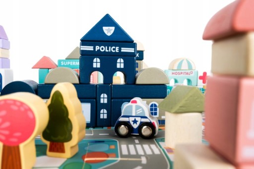 Zabawka, jaką są klocki drewniane miasto, to wiele godzin niesamowitej zabawy dla najmłodszych. Zestaw jest bardzo duży – w jego skład wchodzi aż 115 różnego rodzaju klocków i 20 szt. puzzli imitujących ulicę. Z klocków można układać różnego rodzaju budynki mieszkalne oraz budynki użyteczności publicznej, ponadto zestaw obejmuje również elementy takie jak drewniane pojazdy, znaki, latarnie, a nawet drzewka. Wszystko to sprawia, że edukacyjne klocki miasto to bardzo realistyczna zabawka, która zawsze wygrywa z nudą.