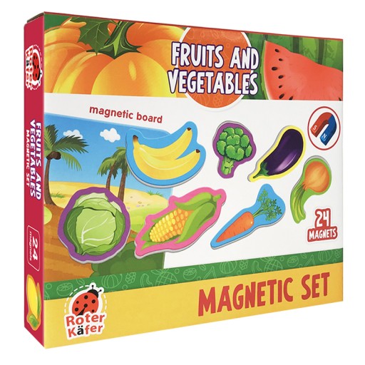 Zestaw magnetyczny z tabliczką - OWOCE i WARZYWA zawiera w komplecie specjalną tabliczkę z obrazem malowniczego krajobrazu, na której można układać figurki zwierząt z farmy. Plansza ma wymiary 16x15cm, a zwierzątka są proporcjonalnych wielkości. Tradycyjne puzzle w powłoką magnetyczną, wygodne i łatwe do chwycenia dla najmłodszych dzieci.