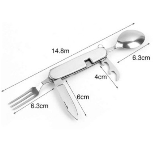 Kompaktowy niezbędnik wykonany ze stali nierdzewnej składający się z łyżki, widelca, noża oraz otwieracza do puszek i kapsli. Po otwarciu widelca i łyżki scyzoryk rozkłada się na dwie części (w jednej łyżka i nóż, a w drugiej widelec) co znacznie ułatwia jego używanie oraz czyszczenie. Dodatkowo niezbędnik posiada niewielkie kółeczko umożliwiające przyczepienie go do sprzętu podróżnego. Jego niewielki rozmiar i waga będą atutem podczas podróży.