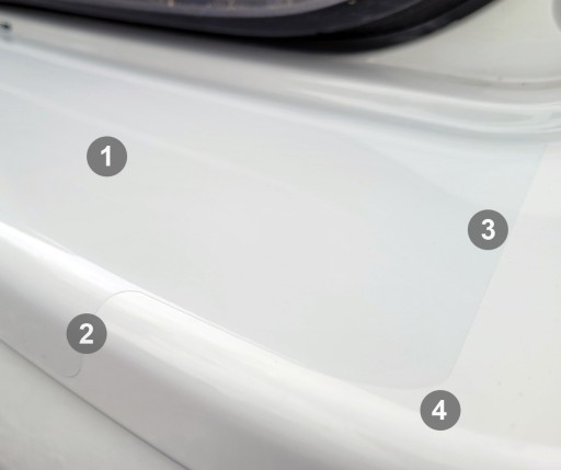 - Specjalne profilowania i kształt folii ułatwiają jej aplikację. Folia uwzględnia krzywiznę zderzaka, a długość dobrana jest tak, aby kończyła się w miejscu optymalnym do samodzielnej aplikacji.